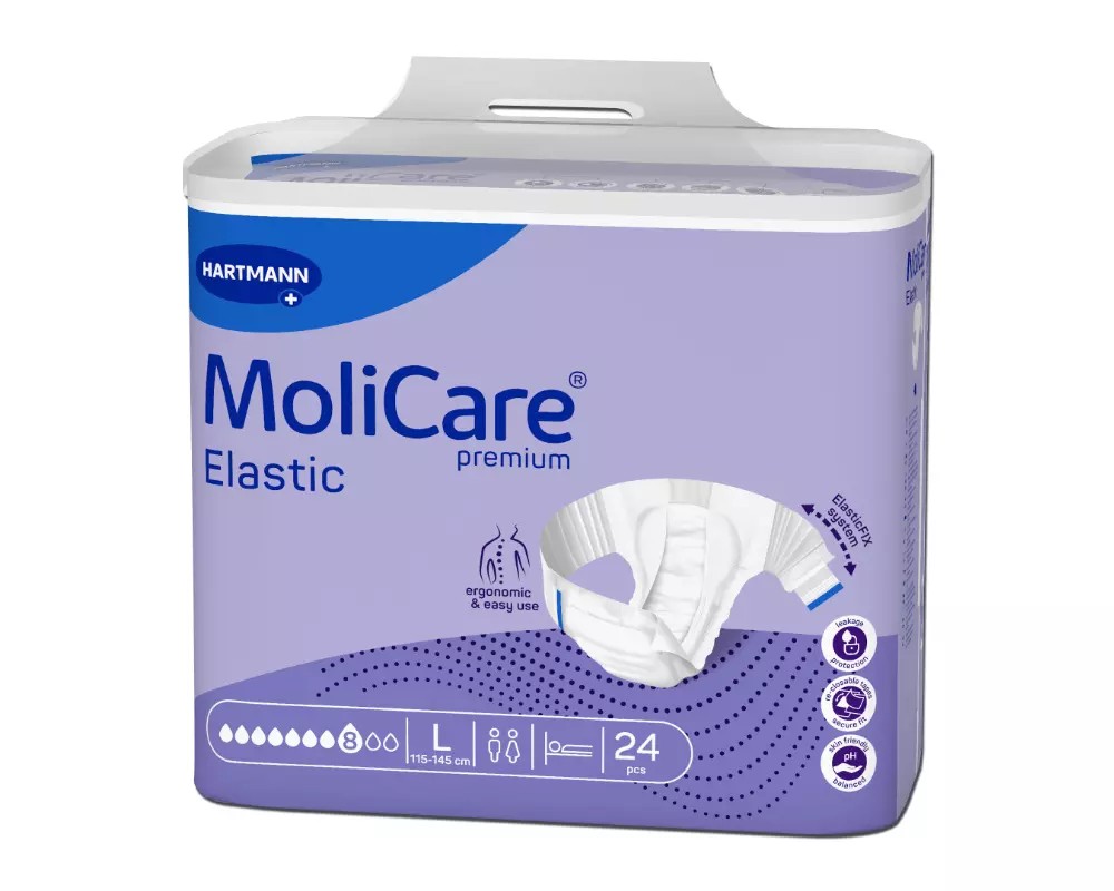 Les changes complets Hartmann Molicare Premium Elastic 8 Gouttes sont indiqués en cas d’incontinence (urinaire/fécale) forte. Ils apportent une protection sûre la nuit mais s’utilisent également en journée si votre cas nécessite une protection renforcée. Possédant un matelas à triple épaisseur doté d’une haute capacité de dispersion et de rétention, ils garantissent un effet garde au sec optimal. Votre sécurité est par ailleurs renforcée par les barrières anti-fuites étanches. La marque a conçu ces protections avec de larges ailes élastifiées et des adhésifs multi repositionnables pour faciliter la mise en place, l’ajustement et le retrait. Ces changes complets sont très agréables au contact de la peau grâce à son fil doux et aéré écartant ainsi les risques d’irritation.