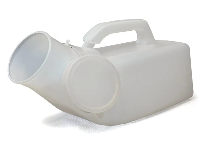 Urinal portable pour homme, muni d'une poignée de transport intégrée et couvercle anti-déversement.